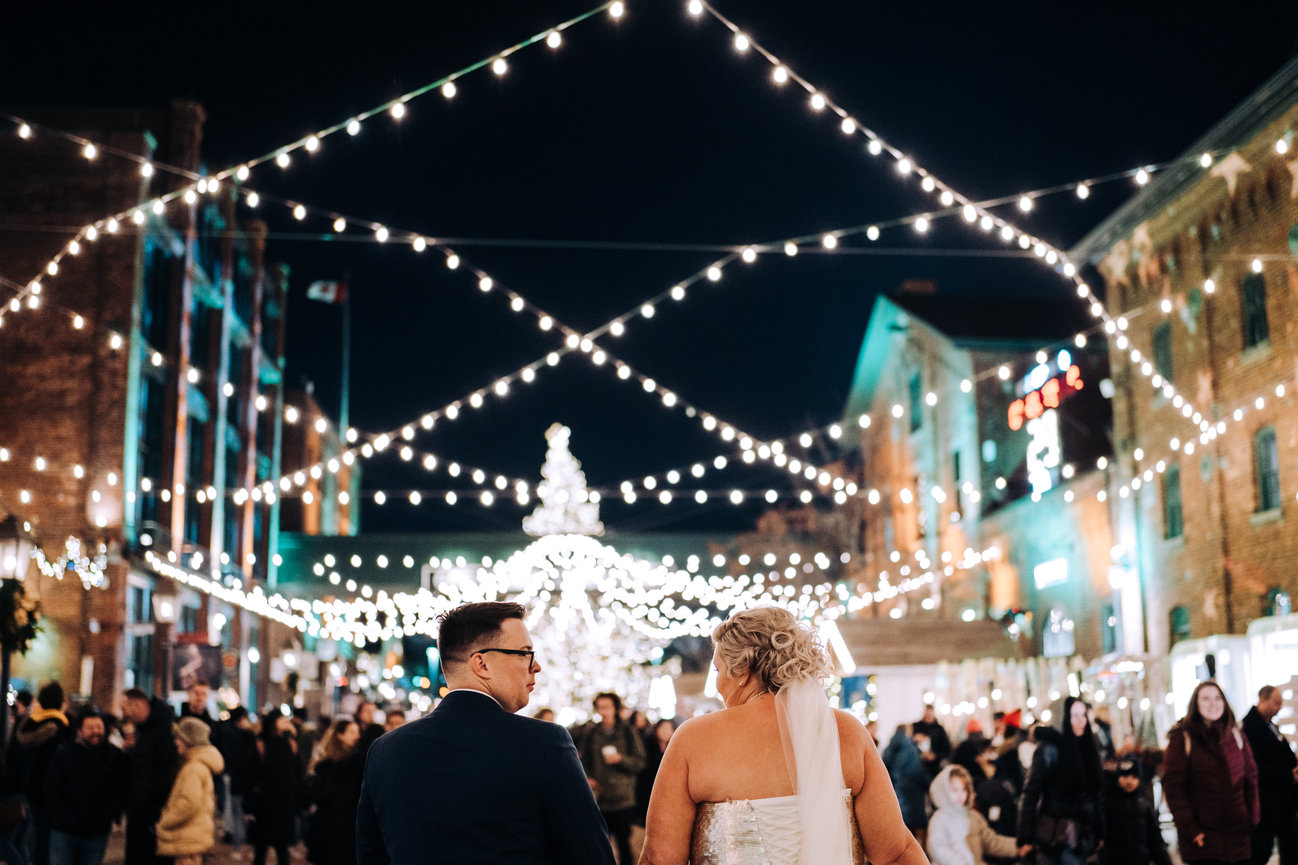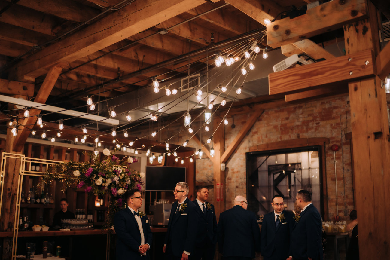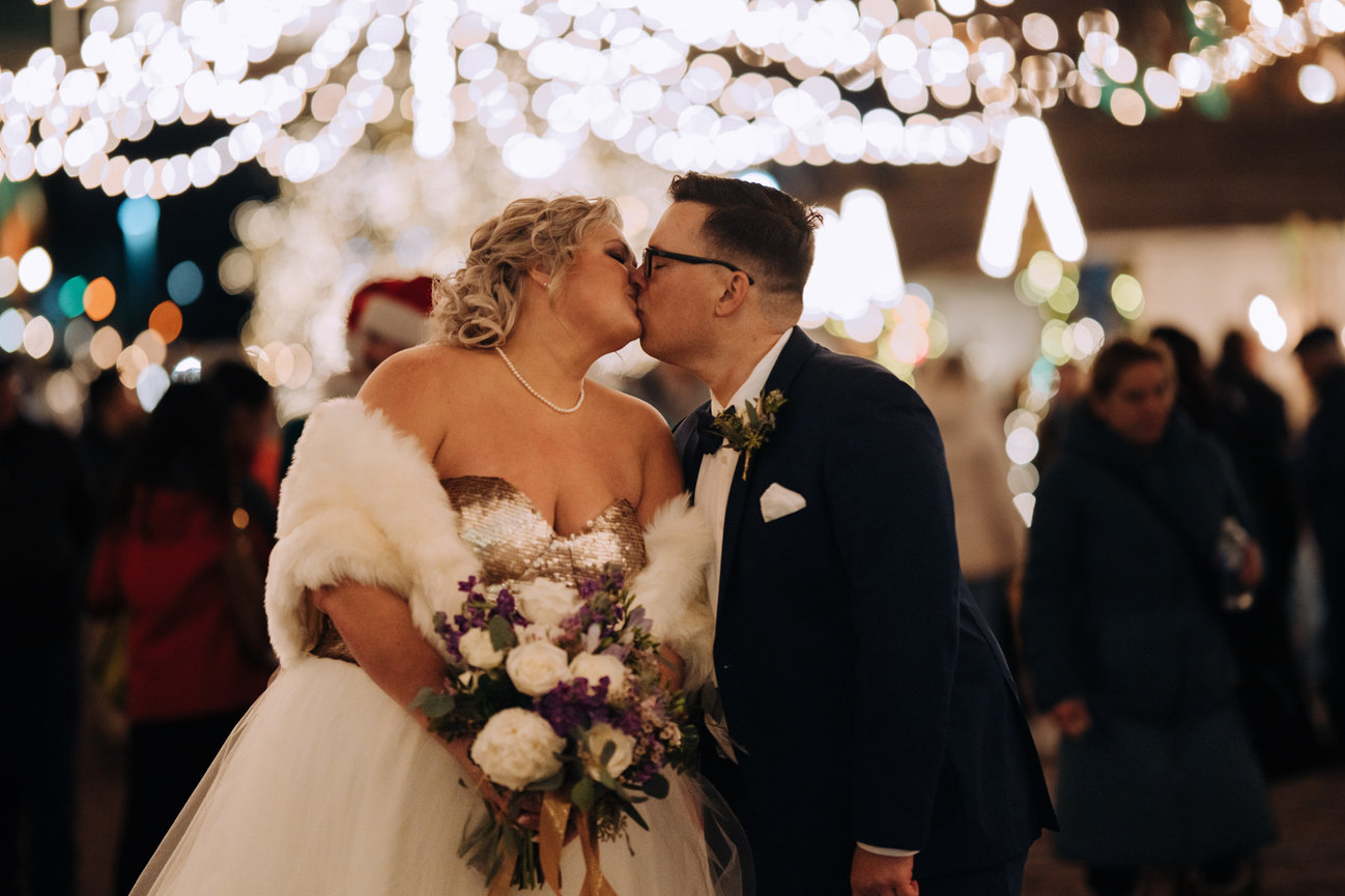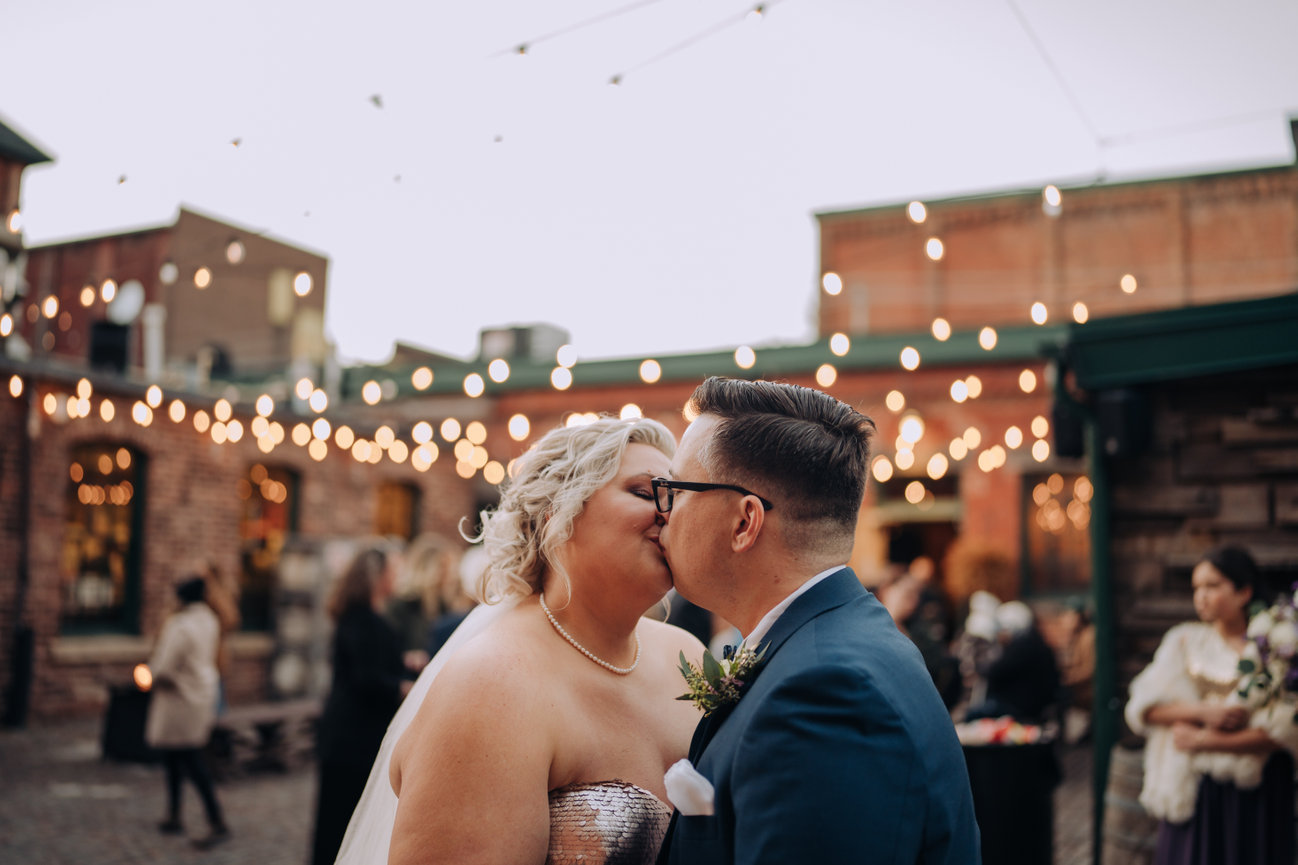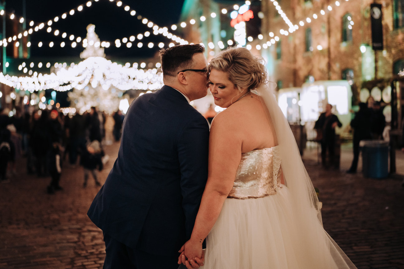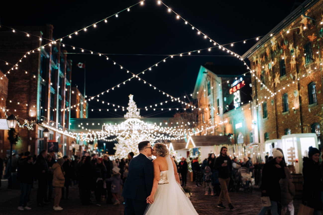 Torontos Distillery district hosts the chic Archeo restaurant and wedding event space. Inside an intimate evening wedding with romantic lighting and beautiful ambiance awaits. Outside a bustling city with voices and lights, hot chocolate and christmas music that fills the night. Here in the middle of the Toronto Christmas market surrounded by their friends and family and in the midsts of thousands of Holiday shoppers, stood two madly in love humans getting married and celebrating their love.