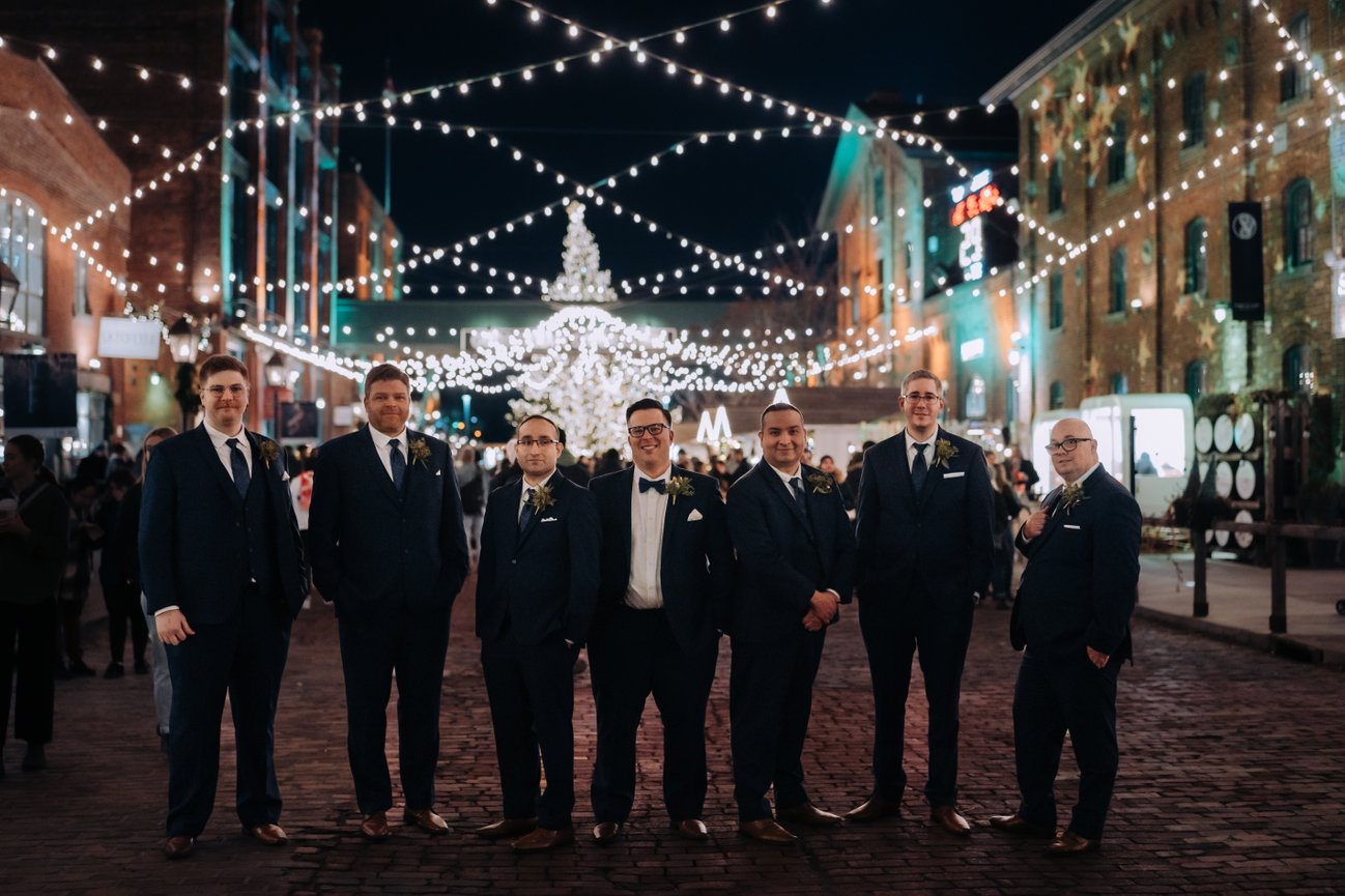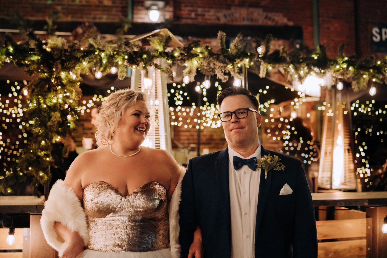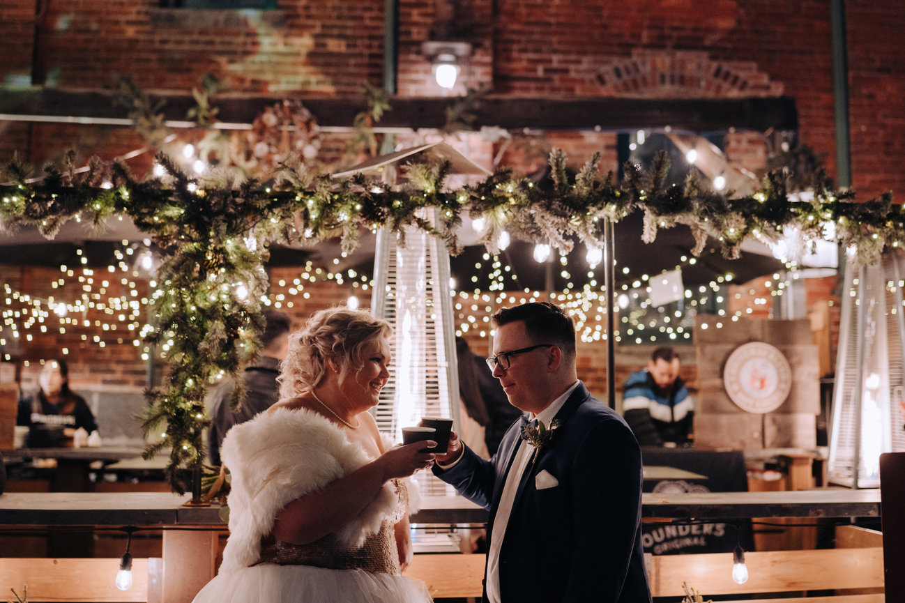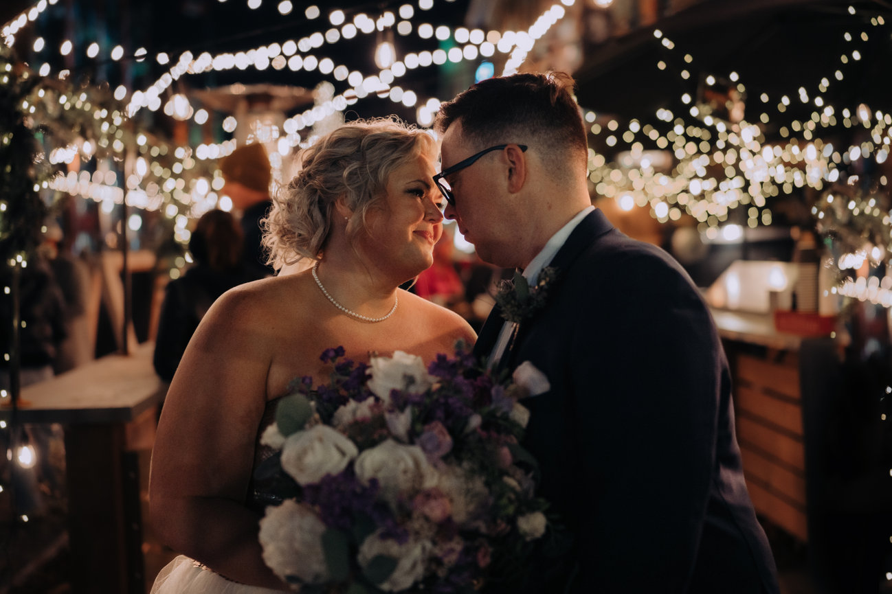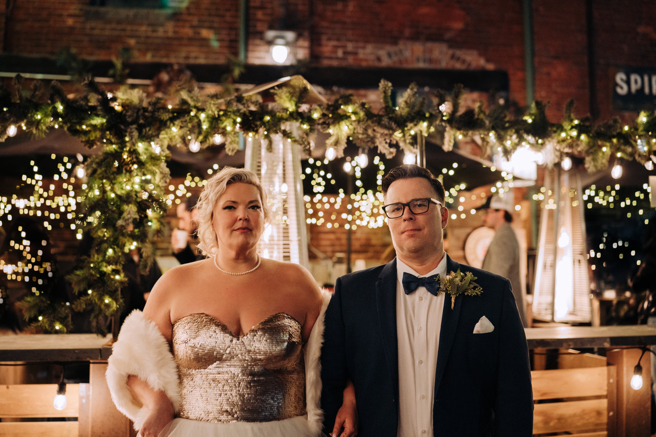Torontos Distillery district hosts the chic Archeo restaurant and wedding event space. Inside an intimate evening wedding with romantic lighting and beautiful ambiance awaits. Outside a bustling city with voices and lights, hot chocolate and christmas music that fills the night. Here in the middle of the Toronto Christmas market surrounded by their friends and family and in the midsts of thousands of Holiday shoppers, stood two madly in love humans getting married and celebrating their love.