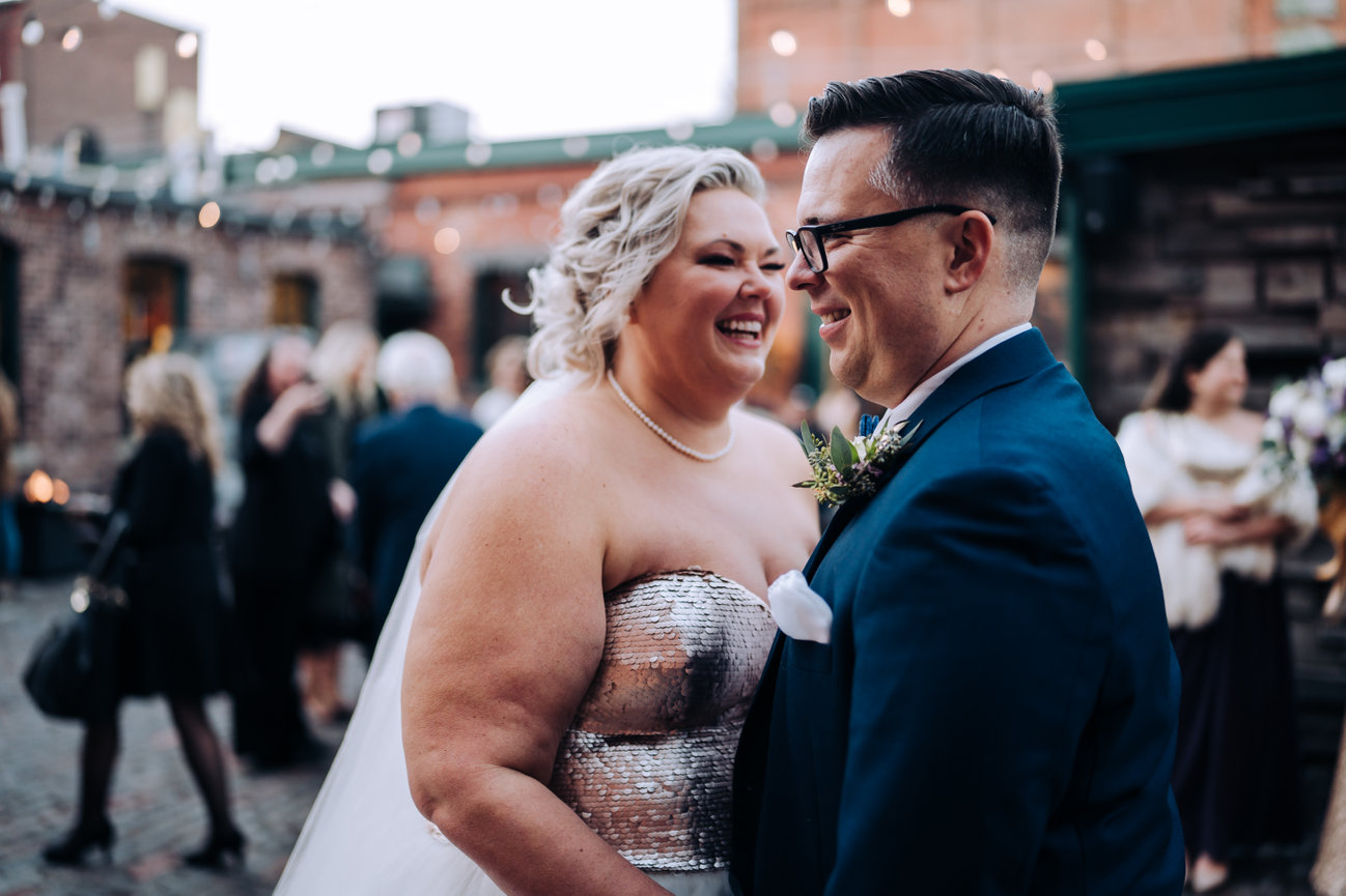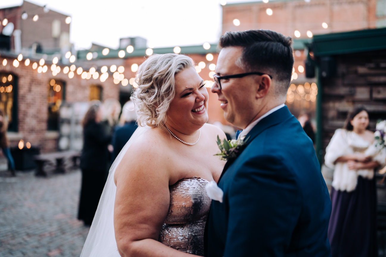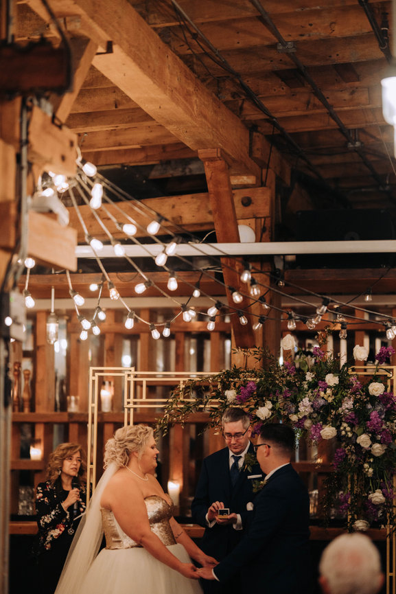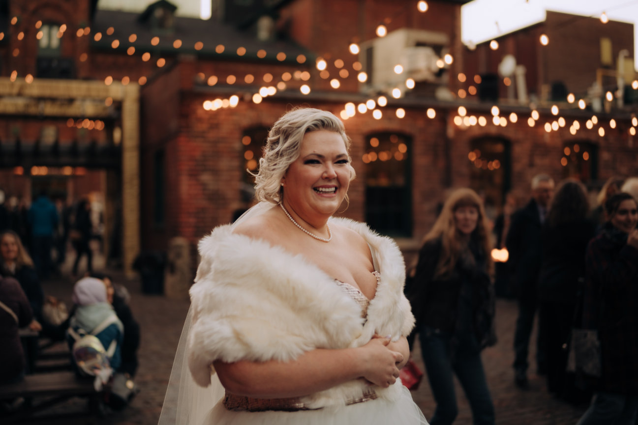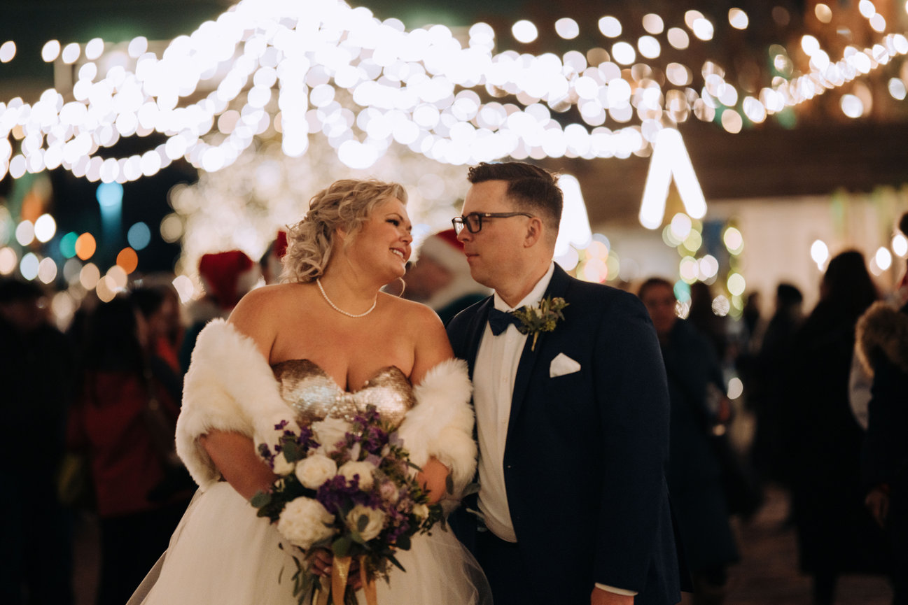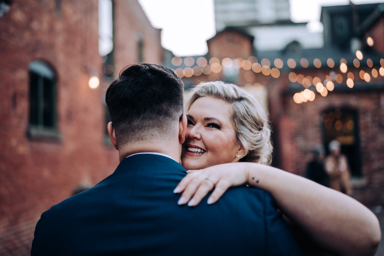 Torontos Distillery district hosts the chic Archeo restaurant and wedding event space. Inside an intimate evening wedding with romantic lighting and beautiful ambiance awaits. Outside a bustling city with voices and lights, hot chocolate and christmas music that fills the night. Here in the middle of the Toronto Christmas market surrounded by their friends and family and in the midsts of thousands of Holiday shoppers, stood two madly in love humans getting married and celebrating their love.