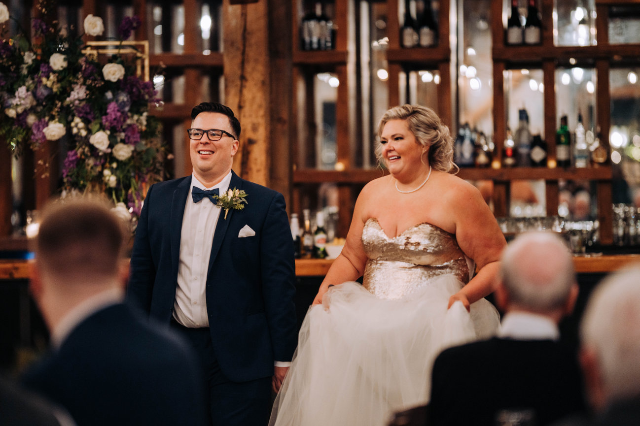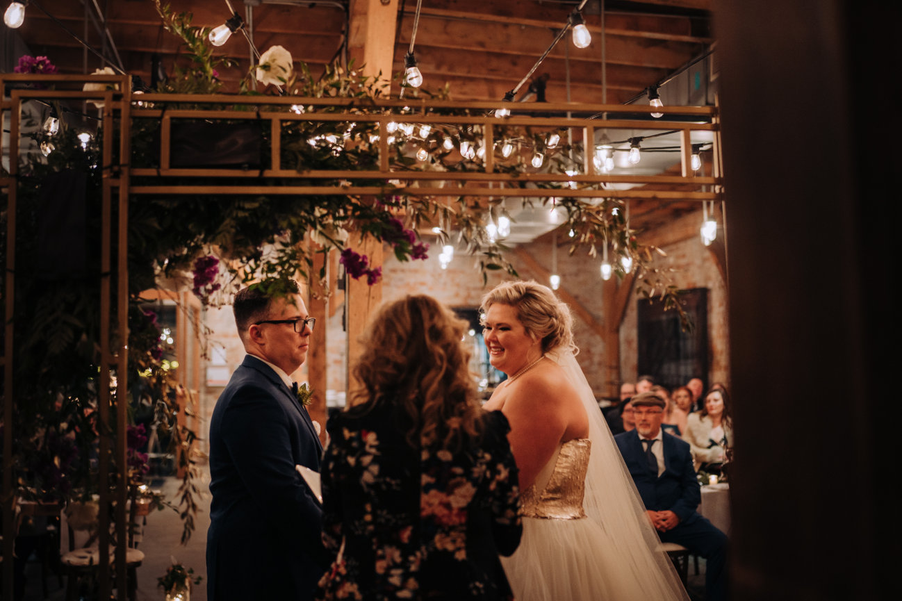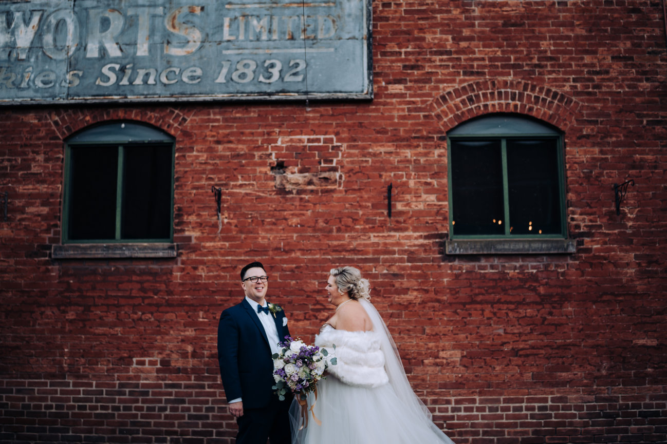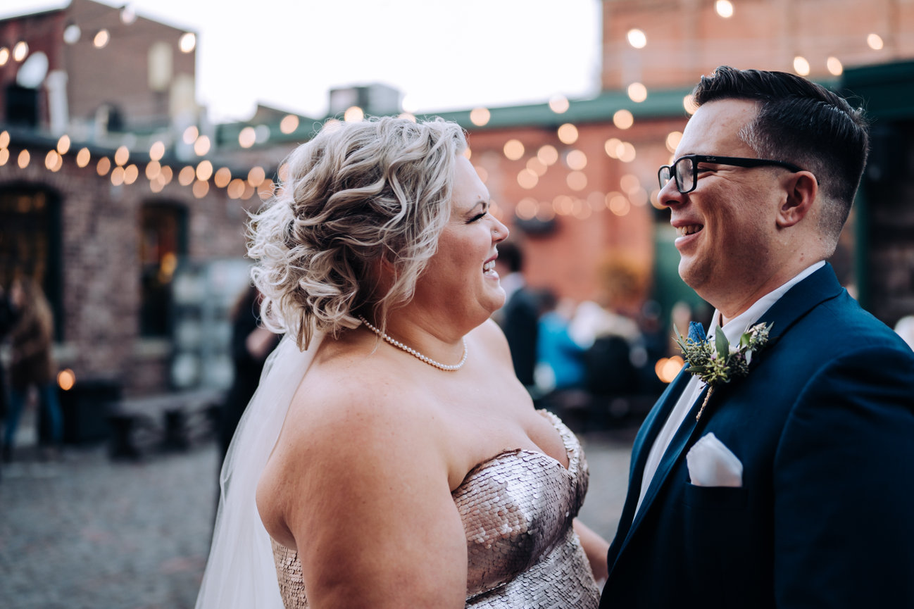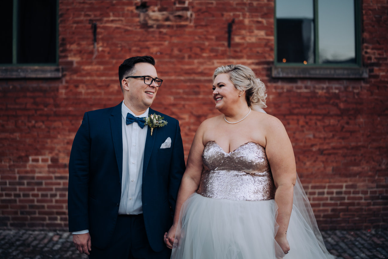 Torontos Distillery district hosts the chic Archeo restaurant and wedding event space. Inside an intimate evening wedding with romantic lighting and beautiful ambiance awaits. Outside a bustling city with voices and lights, hot chocolate and christmas music that fills the night. Here in the middle of the Toronto Christmas market surrounded by their friends and family and in the midsts of thousands of Holiday shoppers, stood two madly in love humans getting married and celebrating their love.